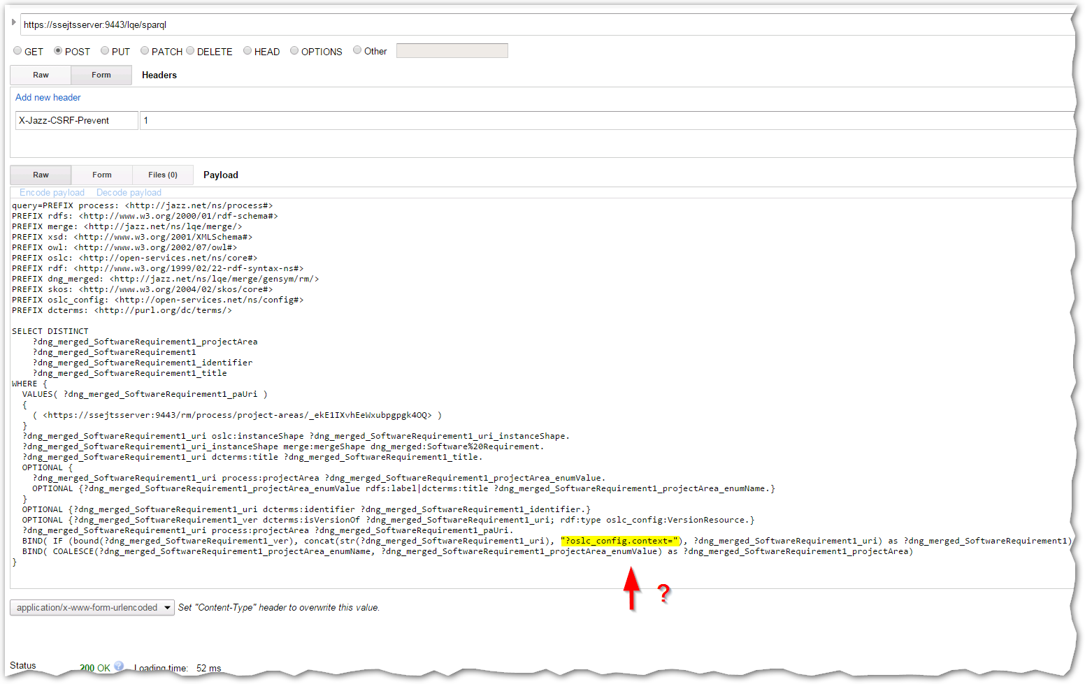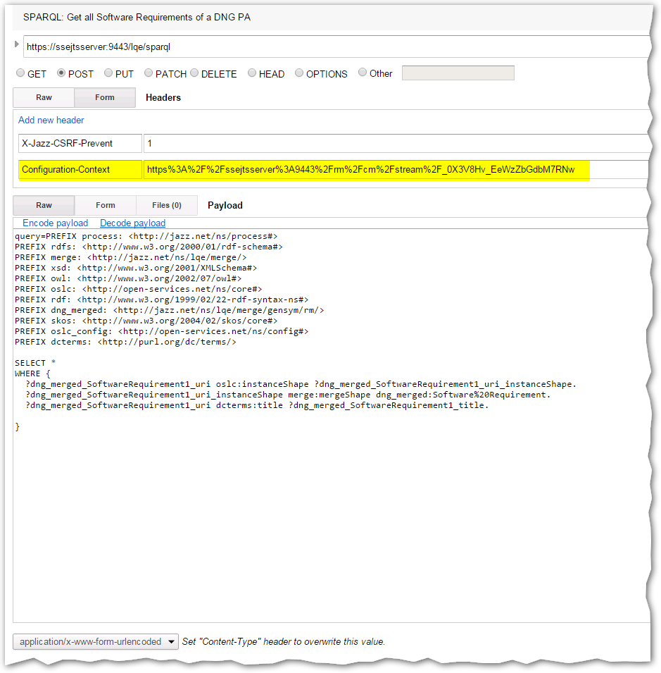 - Use the SPARQL Endpoint https://<LQE Host>:9443/lqe/sparql-variable-config and a header with “Configuration-Context”